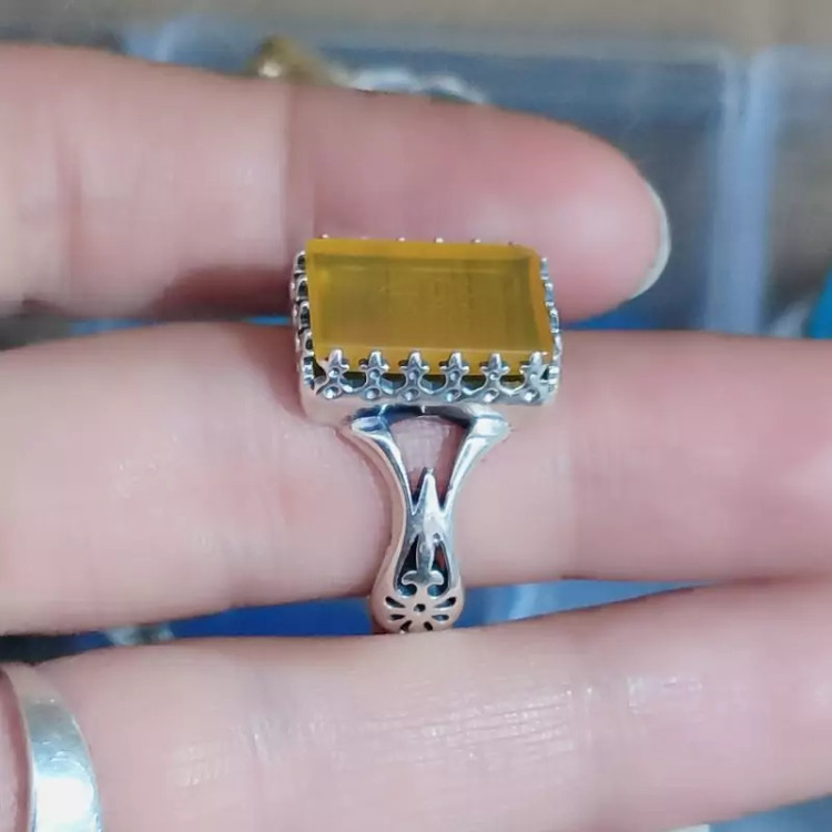 انگشتر مردانه عقیق زرد چهارگوش اصلی و معدنی رکاب نیزه