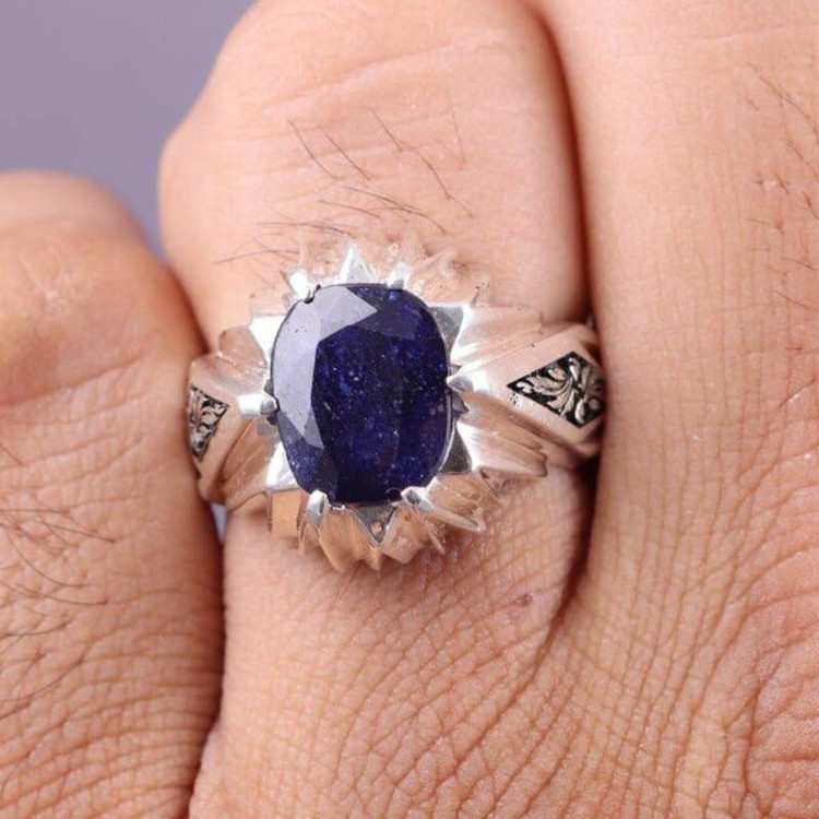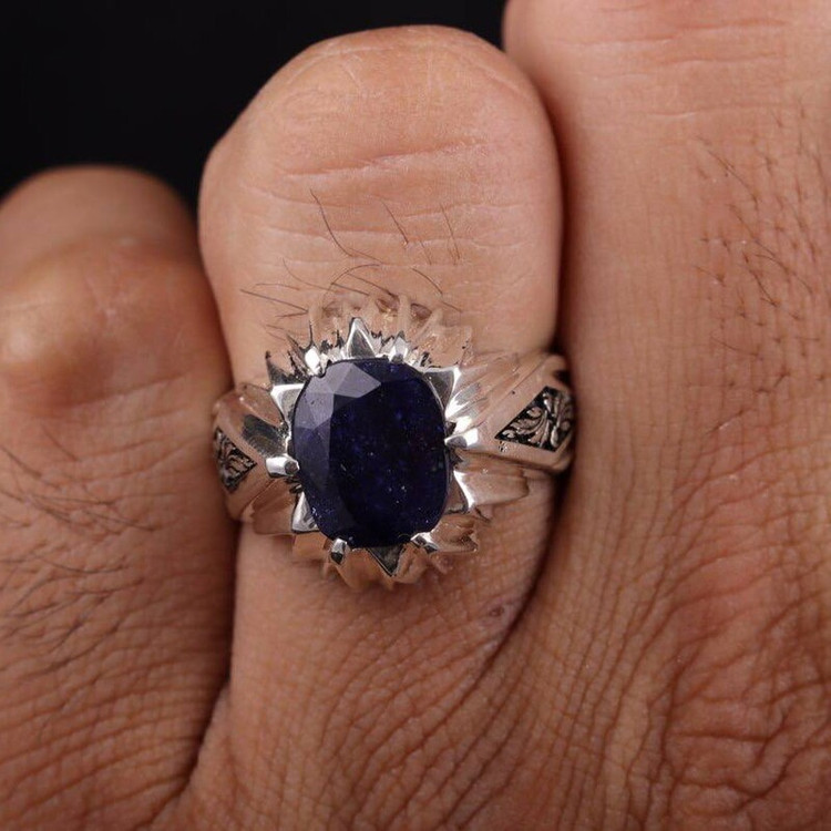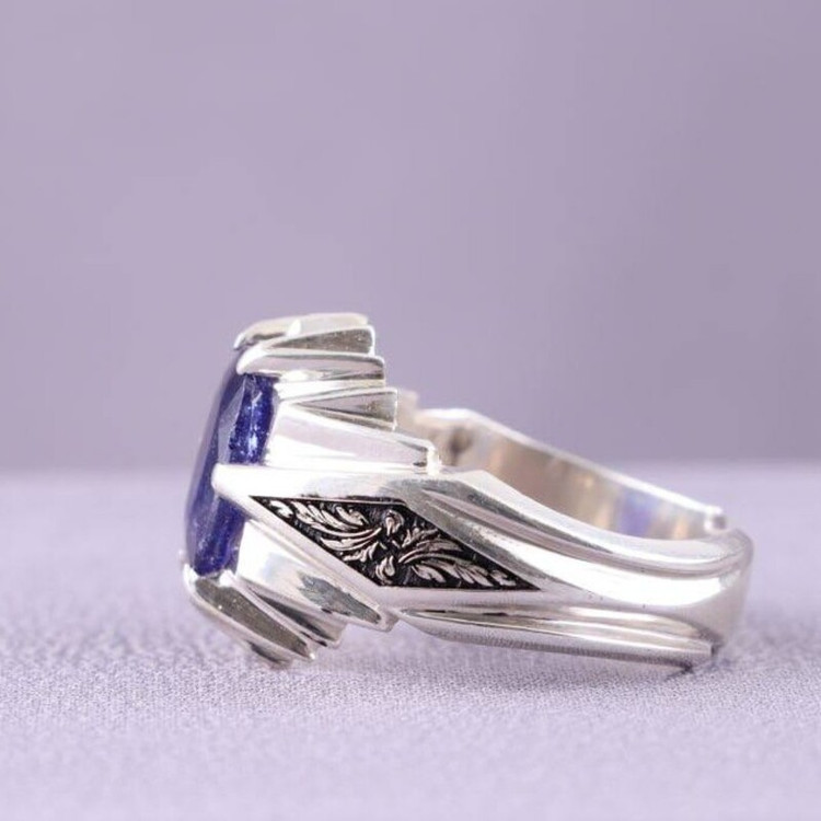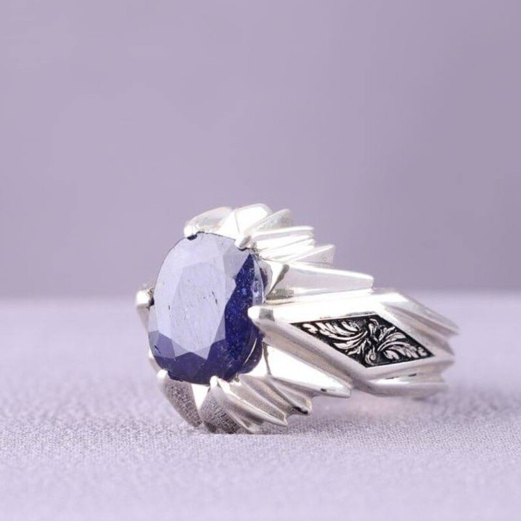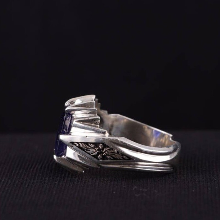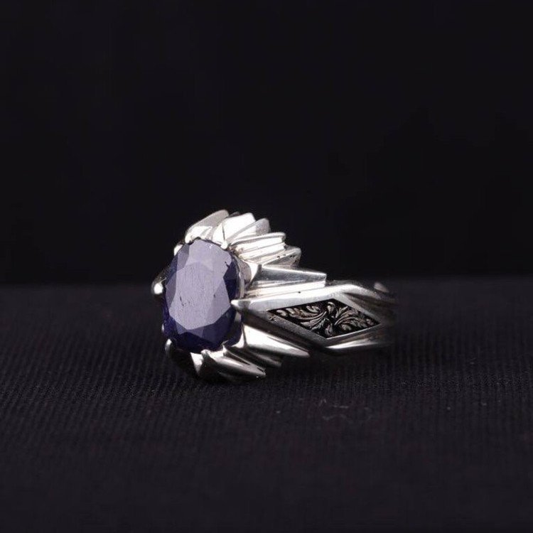 انگشتر نقره مردانه یاقوت کبود آفریقایی دستساز قلمزنی