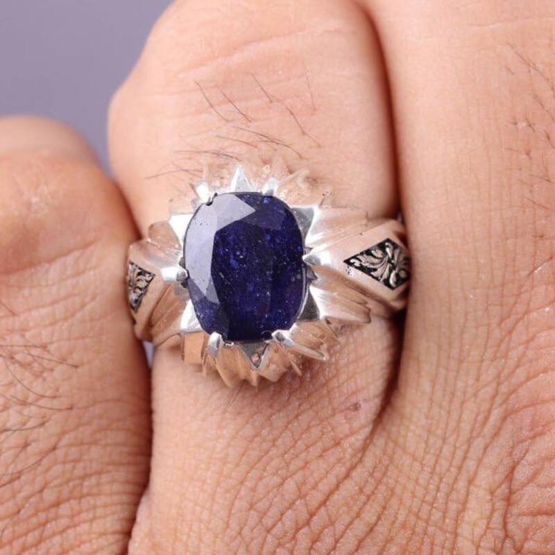 انگشتر نقره مردانه یاقوت کبود آفریقایی دستساز قلمزنی