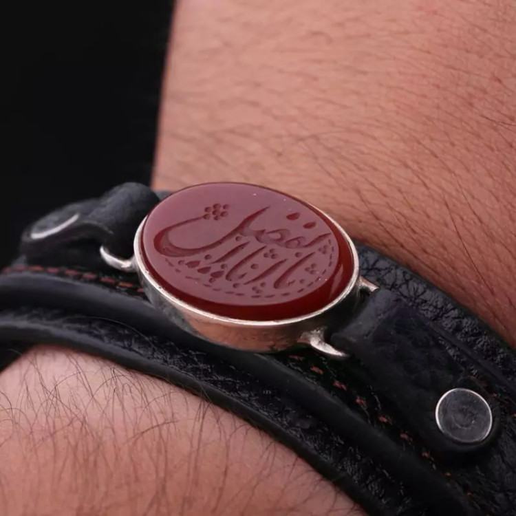 دستبند چرم طبیعی عقیق نقش یااباالفضل اصل ( دستبند مردانه )