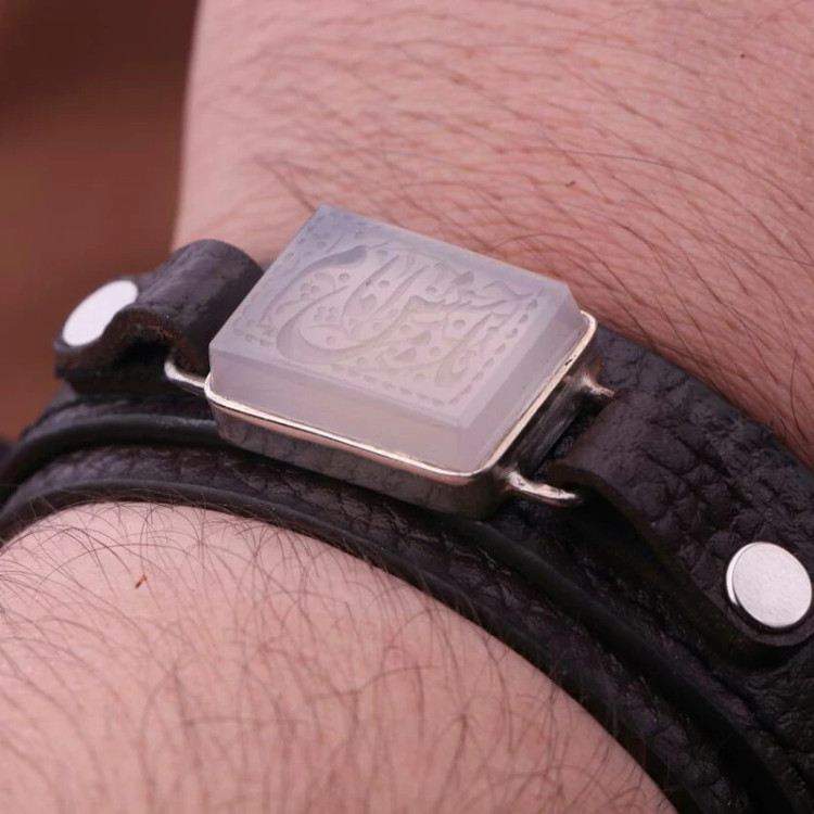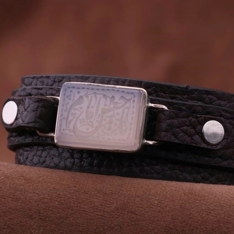 دستبند چرم طبیعی عقیق نقش یاامام حسن مردانه اصل ( انگشتر مردانه )