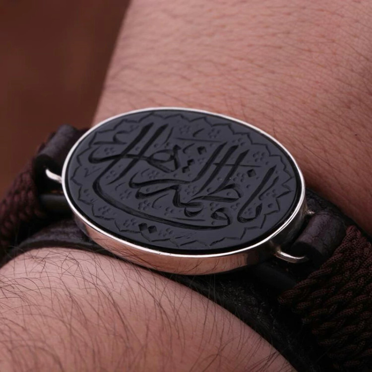 دستبند چرم طبیعی عقیق مشکی نقش یافاطمه الزهرا اصل ( دستبند مردانه )
