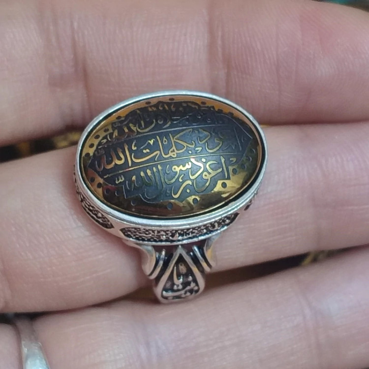 انگشتر مردانه حدید صینی حکاکی سه جلاله نگین طلایی