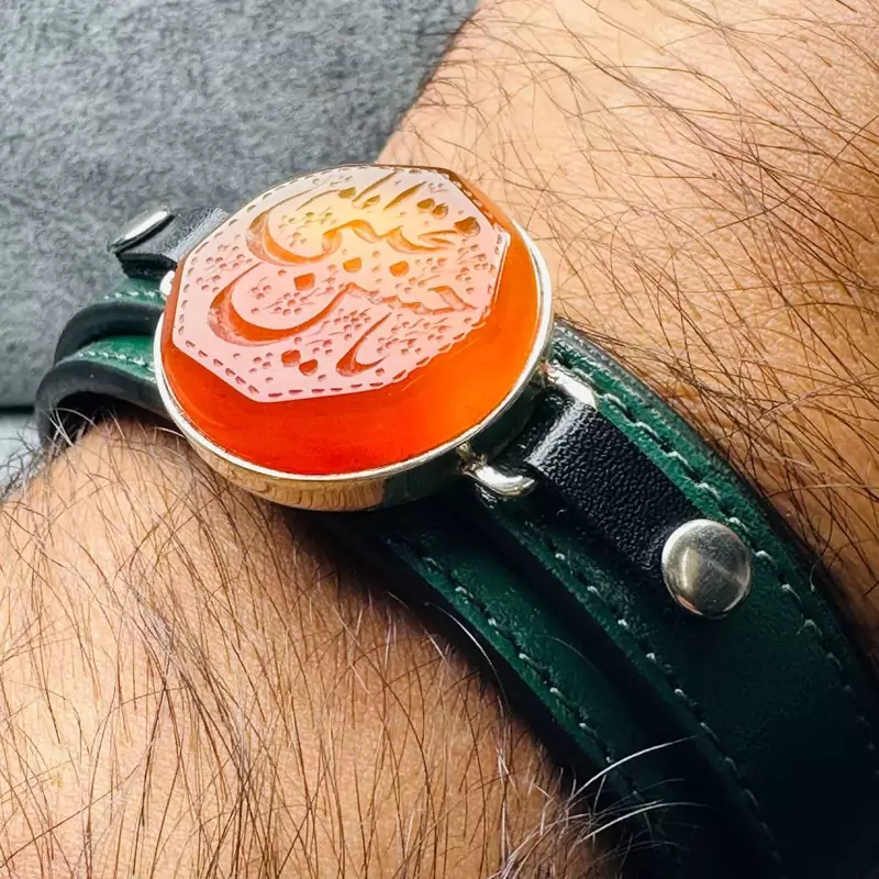 چرم دستبند ، چرم طبیعی گاو می باشد و نگین زیبای آن عقیق اصل با ذکر یا امام حسن مجتبی (ع) است.