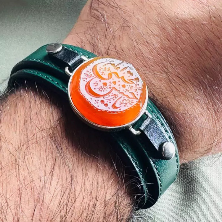 دستبند چرم طبیعی عقیق اصل رکاب دستساز یا امام حسن مجتبی