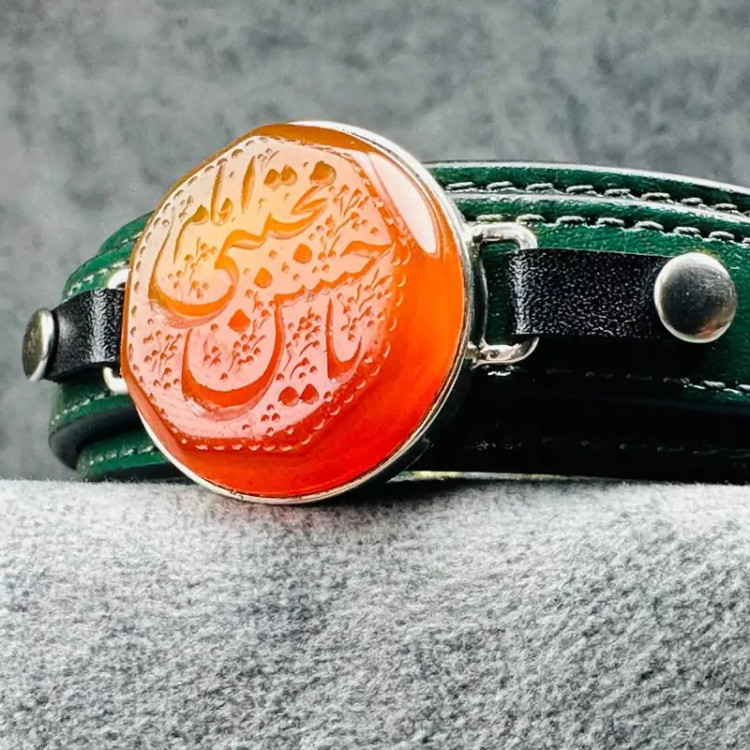 چرم دستبند ، چرم طبیعی گاو می باشد و نگین زیبای آن عقیق اصل با ذکر یا امام حسن مجتبی (ع) است.