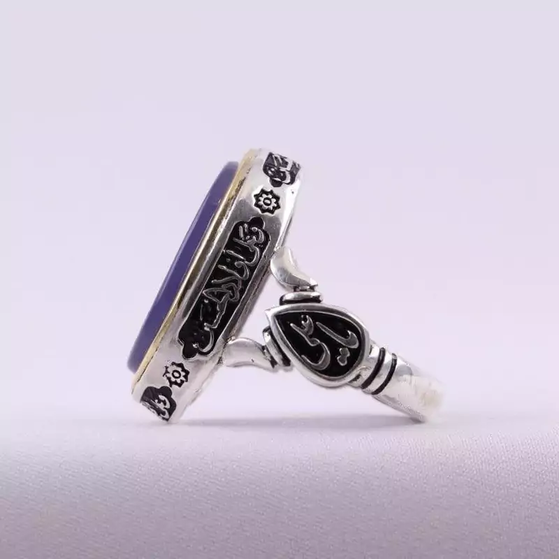 نگین این انگشتر زیبا عقیق کبود اصل با نقش یا فاطمة الزهرا می باشد.