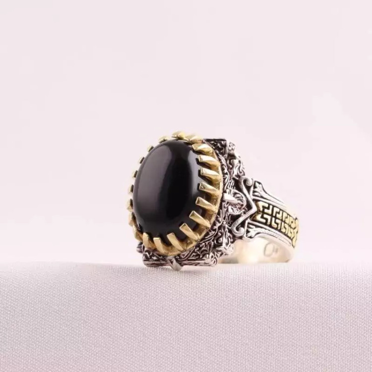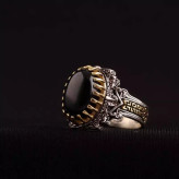 انگشتر نقره مردانه تاج برنجی عقیق سیاه اصل