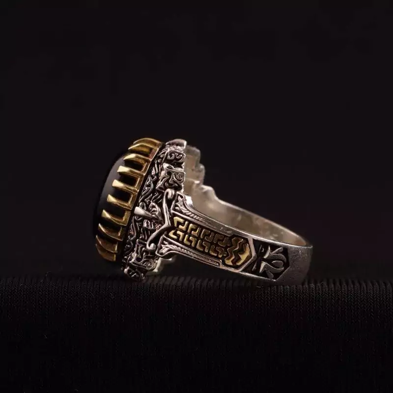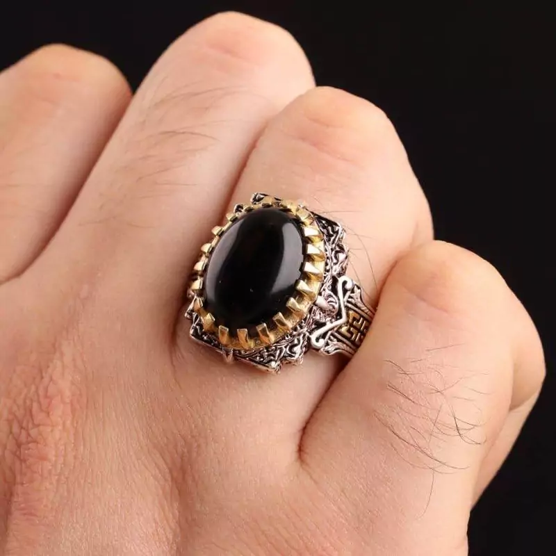 انگشتر نقره مردانه تاج برنجی عقیق سیاه اصل