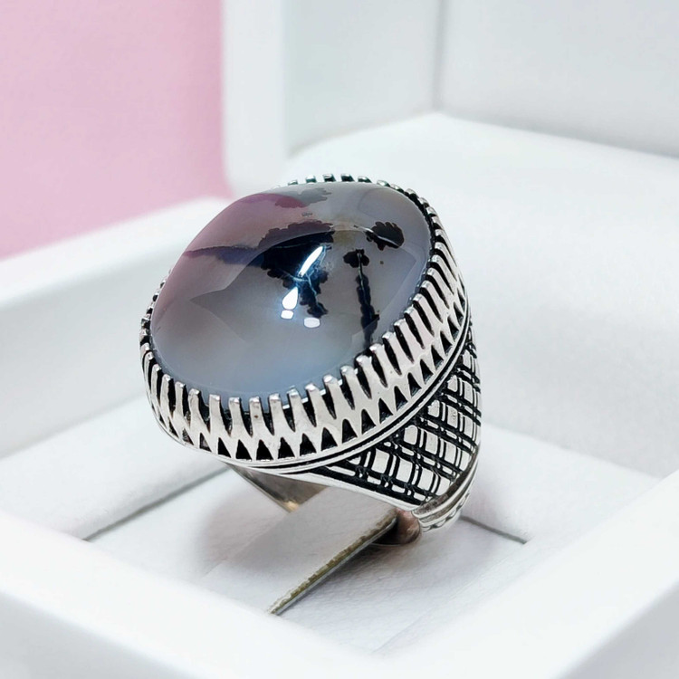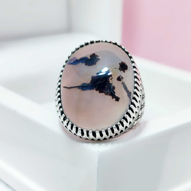 انگشتر شجر حصیری مردانه عقیق سفید نقش سیاه