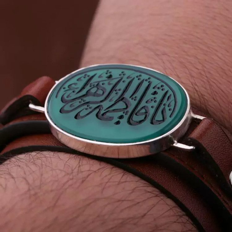 دستبند چرم طبیعی عقیق سبز نقش یافاطمه الزهرا اصل ( دستبند مردانه )