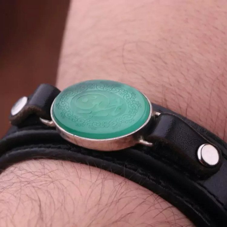 دستبند چرم طبیعی عقیق سبز نقش یاحسین مردانه اصل ( دستبند مردانه )