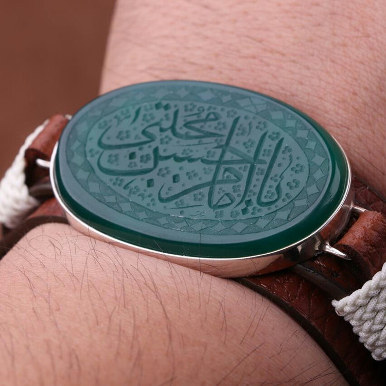 دستبند چرم طبیعی عقیق سبز نقش یا امام حسن مجتبی اصل ( دستبند مردانه )