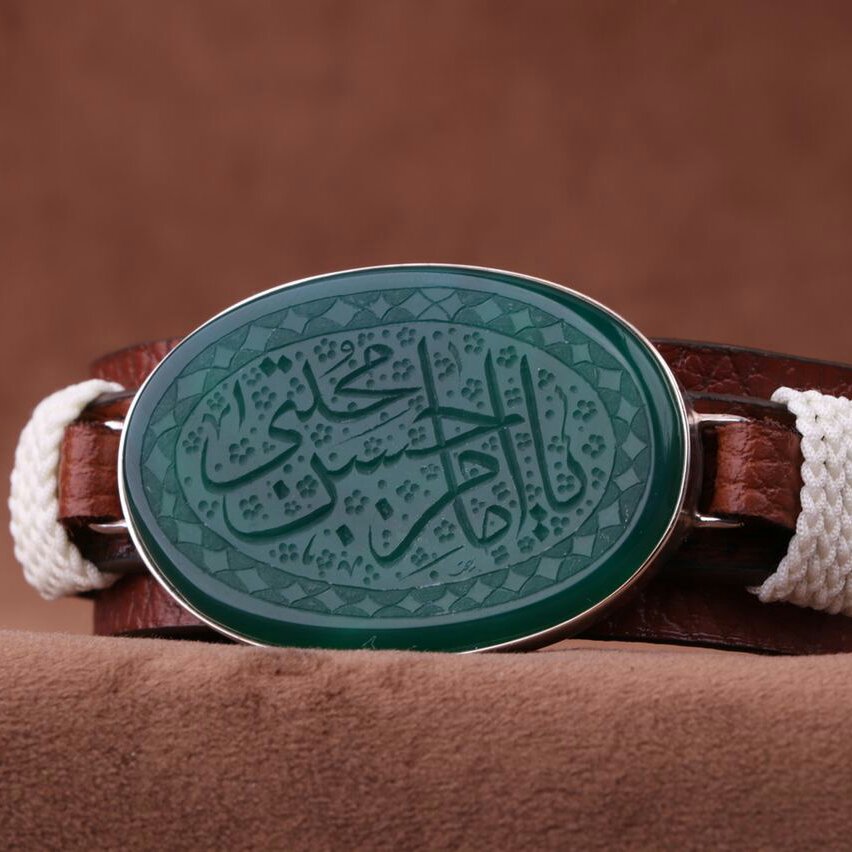 دستبند چرم طبیعی عقیق سبز نقش یا امام حسن مجتبی اصل ( دستبند مردانه )
