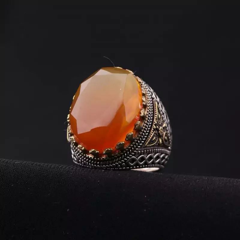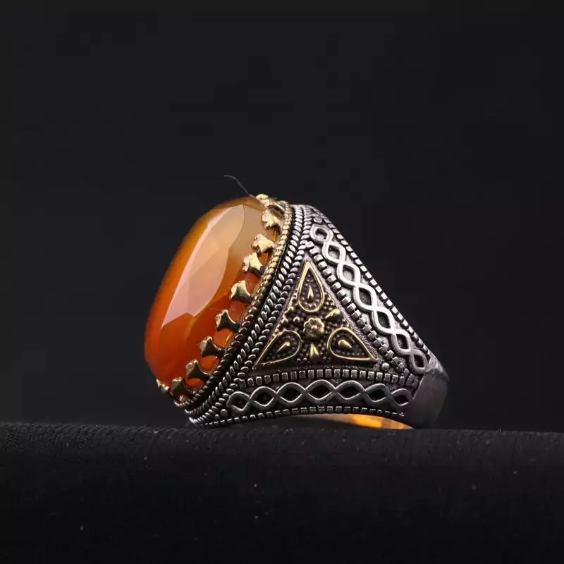 انگشتر عقیق زرد تراش الماسی رکاب تاج و کنار برنجی اصل ( انگشتر مردانه )