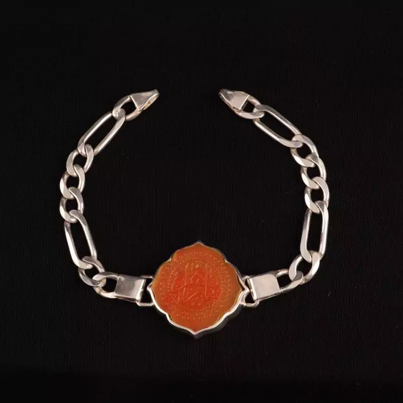 این دستبند نقره دستساز می باشد. نگین عقیق اصل خوش رنگ با نقش یا زهرا (س) است. مدل بند دستبند فیگارو است.