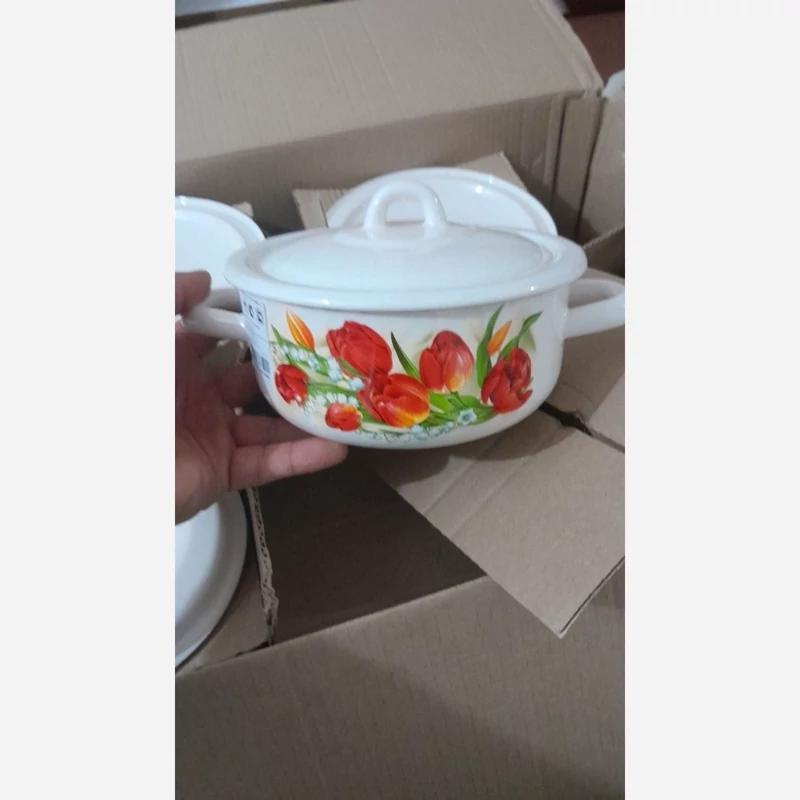قابلمه تک بسیار زیبای لعابی رنگ سفید صدفی طرح گل ِلاله یک ونیم لیتری شعله مستقیم و کیفیت بالا ضخیم و کاربردی مخصوص پخت و پز قطر17 ارتفاع 8