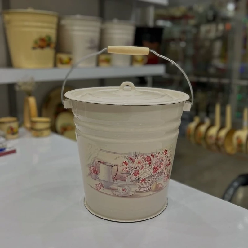 سطل 12 لیتری لعابی محصول کشور روسیه درجه یک و کاربردی بسیار ضخیم و باکیفیت دسته چوبی طرح زیبای گل صورتی