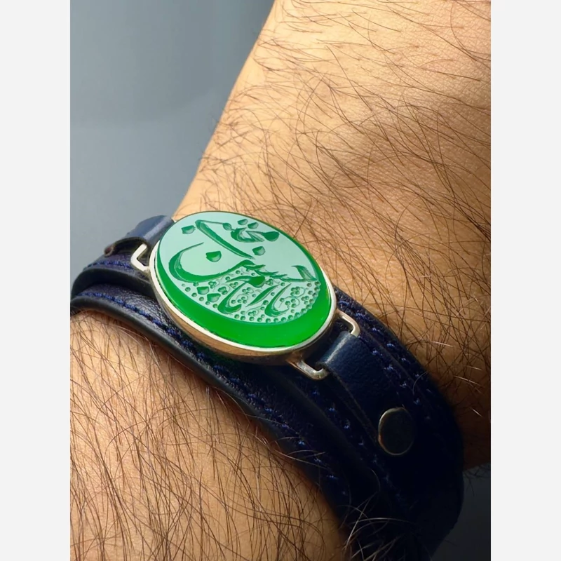 عقیق سبز یا امام حسن مجتبی دستبند چرم طبیعی