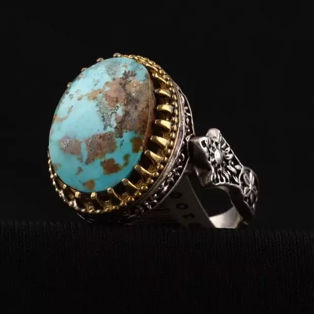 انگشتر نقره مردانه فیروزه نیشابوری رگه طبیعی رکاب تاج برنجی اصل ( انگشتر مردانه )