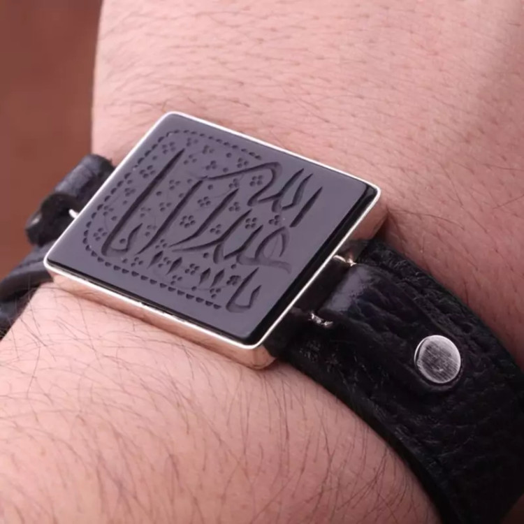 دستبند چرم طبیعی عقیق مشکی نقش یااباعبدالله اصل ( دستبند مردانه )