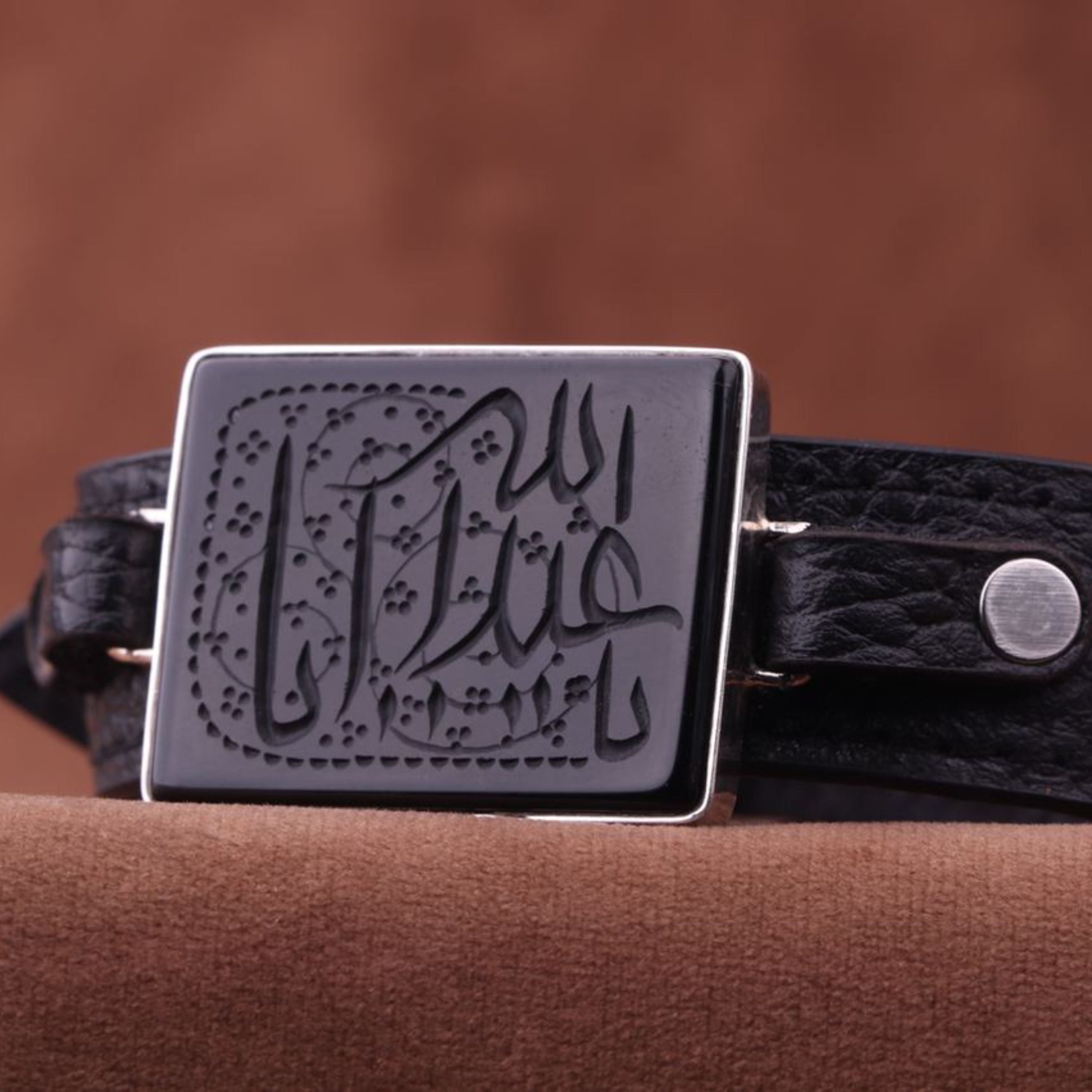 دستبند چرم طبیعی عقیق مشکی نقش یااباعبدالله اصل ( دستبند مردانه )