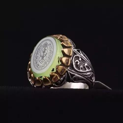 انگشتر مردانه عقیق سبز رکاب تاج برنجی نقش سوره العصر اصل ( انگشتر نقره مردانه )