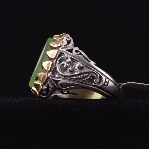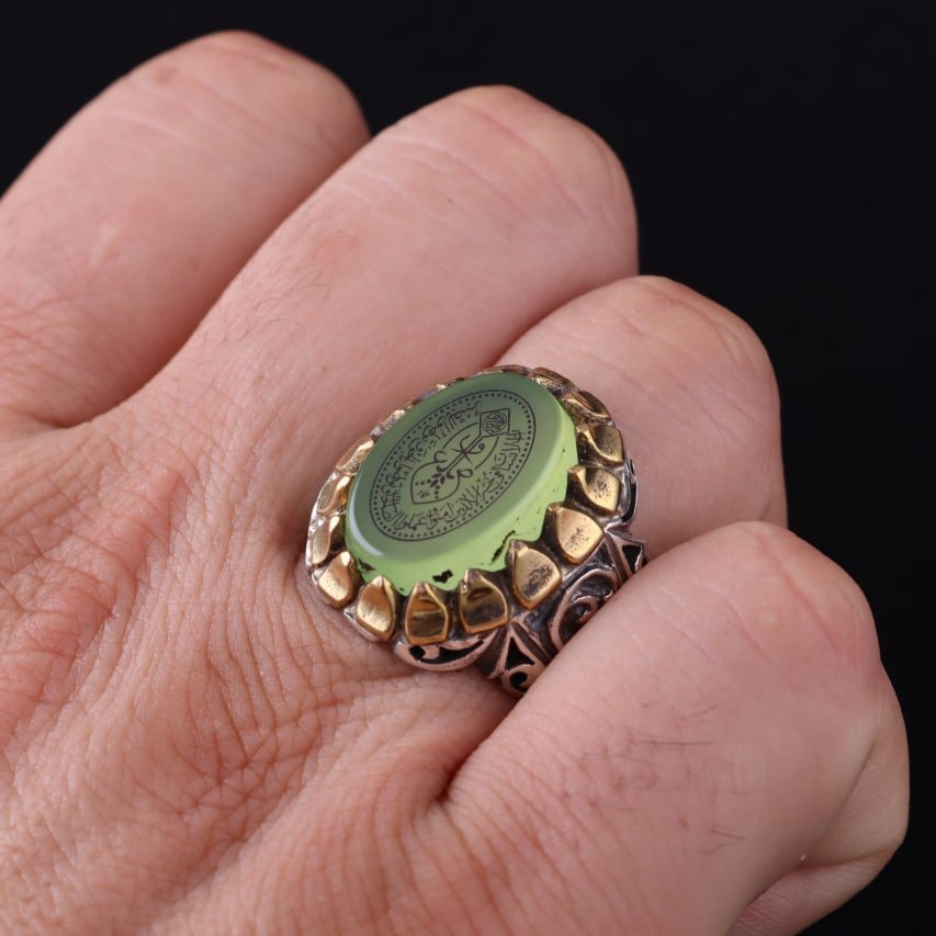 انگشتر مردانه عقیق سبز رکاب تاج برنجی نقش سوره العصر اصل ( انگشتر نقره مردانه )