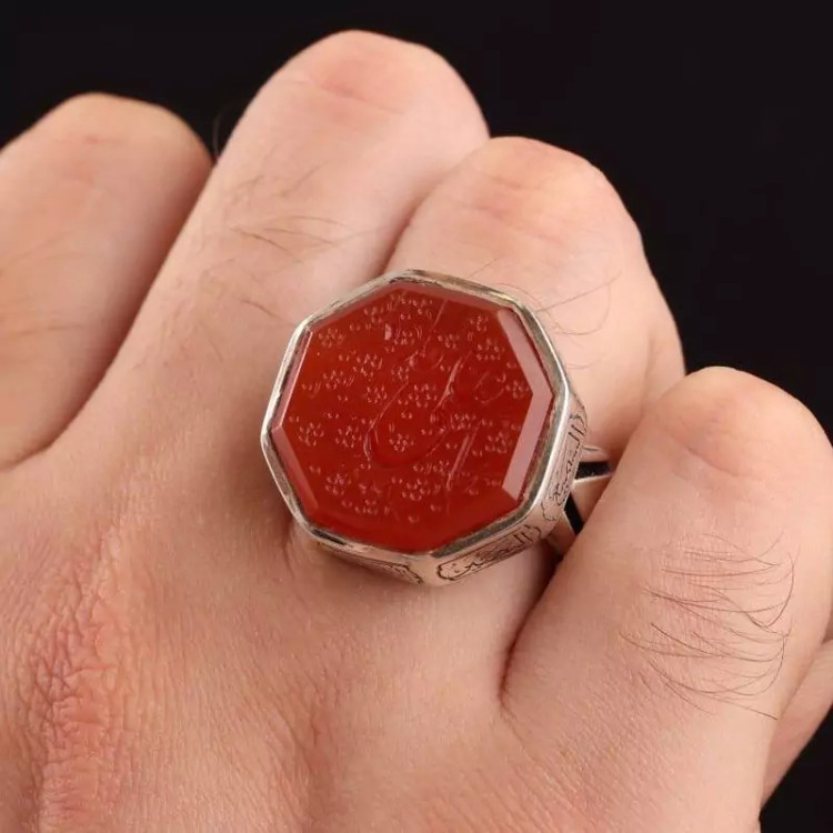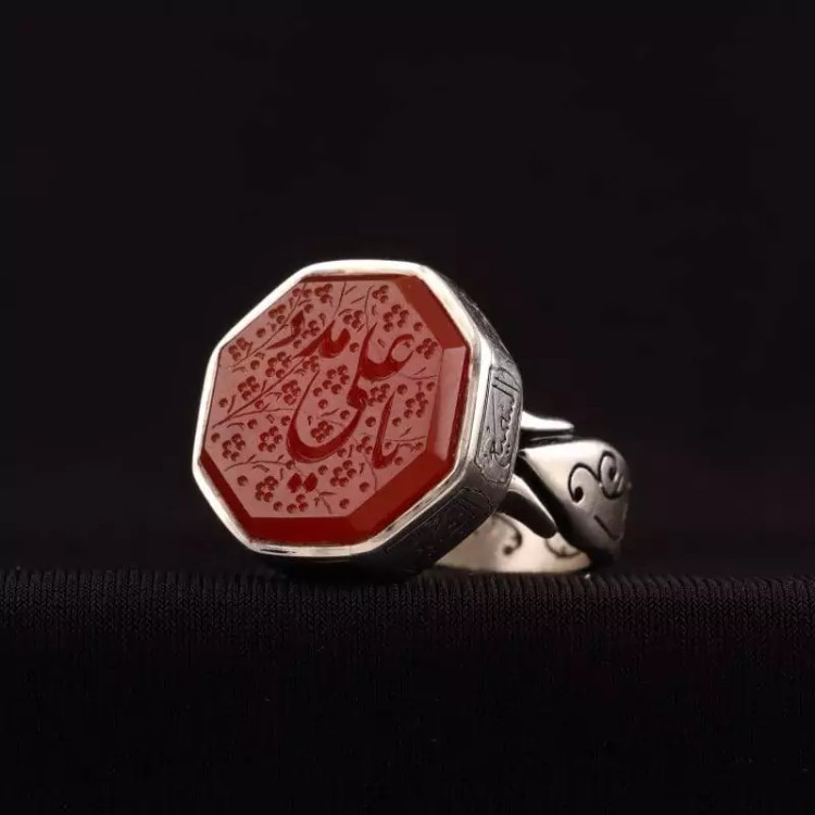 رکاب انگشتر دستساز و نقره 925 عیار و دارای قمزنی اسماالله می باشد و نگین انگشتر عقیق یمنی سرخ اصل با ذکر یا علی مدد است.